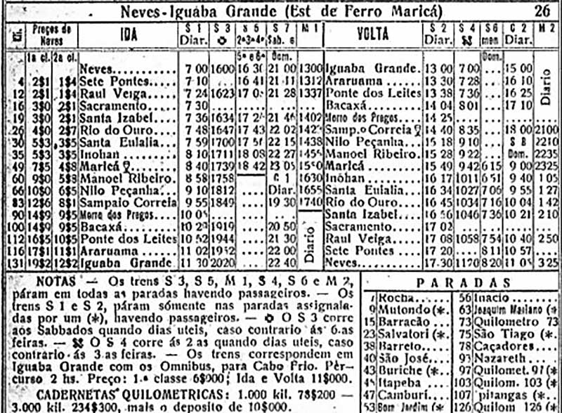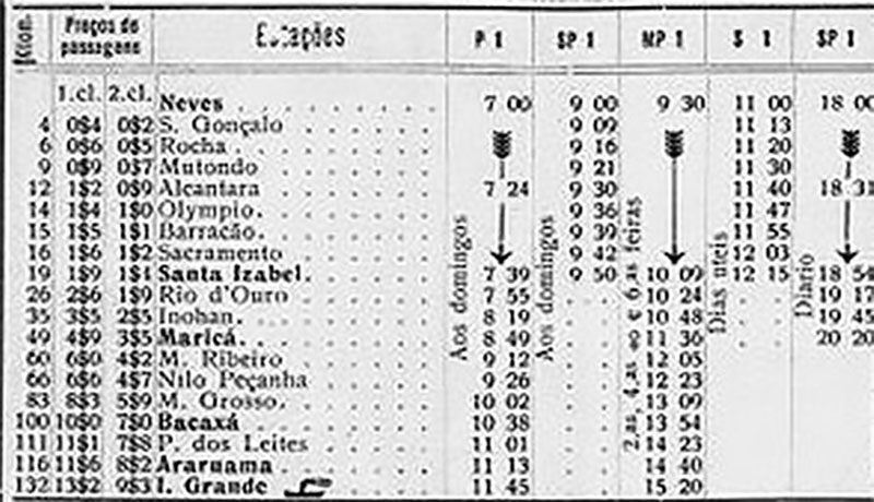 Guia Levi, p. 69 em maio de 1936: Paradas do trem saído de Neves, passando por Sete Pontes, entrando no trajeto que leva ao Lindo Parque e Rocha, atualmente, chegando até Alcântara, rumando à região dos Lagos.