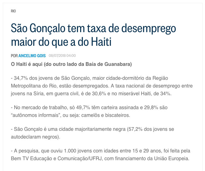 Como qualquer gonçalense, piso na cidade, que de nada tem culpa. Há mais de três anos jogo na cara dela, publicamente, a violência, o esgoto a céu aberto, as ruas sem asfalto e sem iluminação e ela nunca reclama. Mas amo essa cidade que abraça sem distinção os caídos em seu território. E o que mais amo é esse acolhimento das pequenas coisas por cada um que vive ou somente passa por aqui em direção à Região dos Lagos.